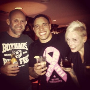 Das Fundstück hier…ihr Trainer Mal „Big Croc“ Vanderaar entschied sich als Abendgarderobe für das Boxhaus Ringside T-Shirt, an der Seite von Pat „HD“ Barry und Bec Hyatt.