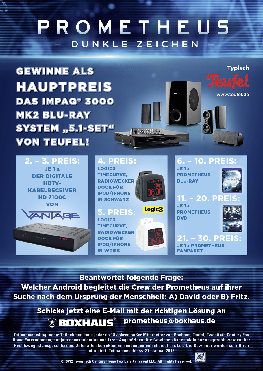 Zum Blu-ray- und DVD-Release des Actionkrachers „Prometheus – Dunkle Zeichen“ verlosen wir gemeinsam mit den Hardware-Partnern Teufel, Vantage und Logic3 insgesamt 30 tolle Preise!