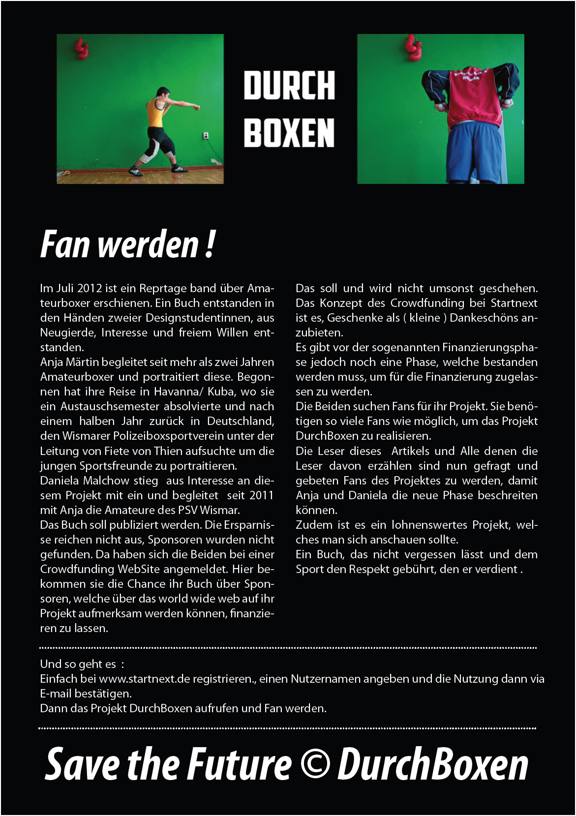 DurchBoxen ist ein Reportage Bildband über Amateurboxen…über startnext.de, der größten Crouwdfunding-Community im deutschen Raum, soll das ganze realisiert werden.
