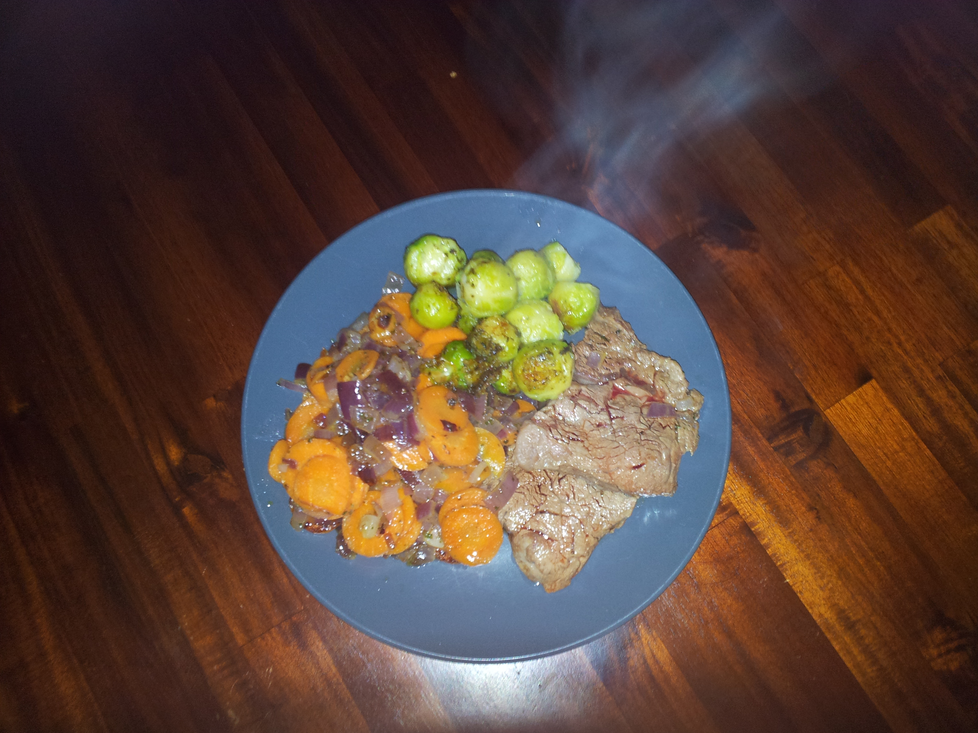 Entrecote´ vom Bison mit angebratenen Karotten und Rosenkohl, geeignet als Mittagessen und als Abendessen.