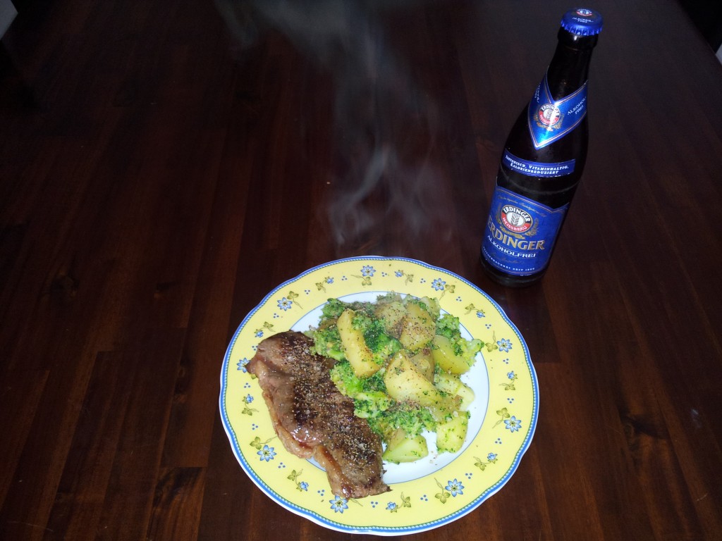Zutaten: 250 g Kartoffeln geschnitten kochen, 200 g Broccoli dünsten und beides zusammen mit etwas Mandelbutter anbraten. 200 g Entrecote vom Weidebison braten und alles zusammen servieren.