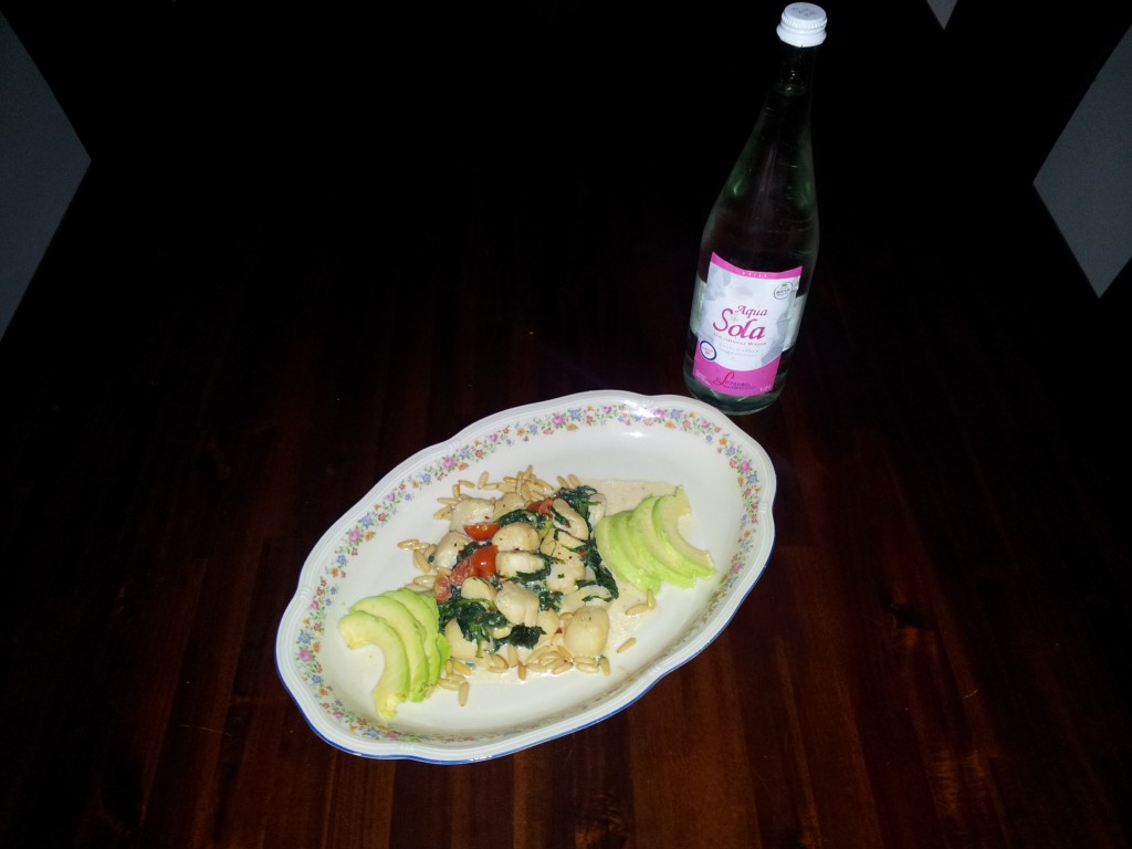Zutaten: 200 g Spinat in einem Topf mit 4 EL Öl, Salz und Pfeffer zerfallen lassen. Jakobsmuscheln mit Salz, Pfeffer und Zitronensaft in einer Pfanne braten und zusammen mit dem Spinat, 200 g Romatomaten geschnitten und ein bisschen Sahnesauce köcheln lassen. Alles zusammen mit einer geschnittenen Avocado und gebratenen Pinienkernen sevieren.