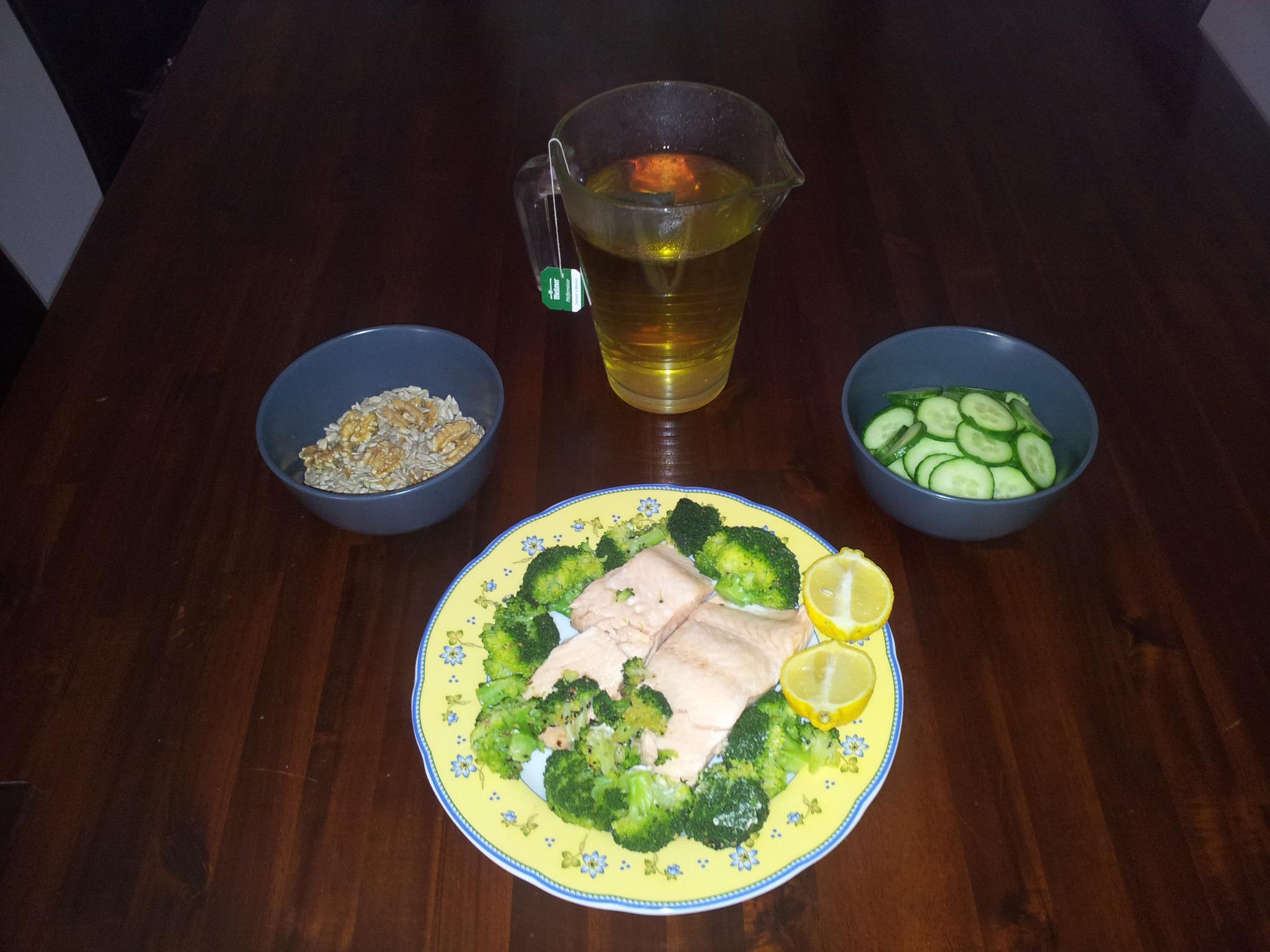 Zutaten: Salatdressing: 2 EL Avocadoöl, 2 Esslöffel milden Balsamicoessig, Salz, Pfeffer Salat: 0,5 Gurke in Scheiben geschnitten. 200 g Lachsfilet zusammen mit 250 g Broccoli dünsten. Beilage: 25 g Sonnenblumenkerne, 25 g Wallnüsse