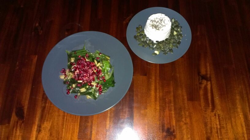 Zutaten: 1 Mangoldstiehl in Stücke schneiden und zusammen mit 50 g Pinienkernen in 25 g Mandelbutter anbraten und zusammen mit Kernen aus einem Granatapfel, 200 g körnigem Frischkäse und 25 g Kürbiskernen servieren.