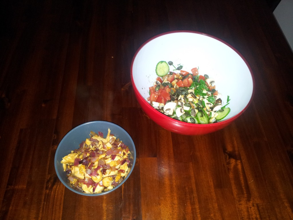 0.5 Gurke geschnitten, 1 Tomate geschnitten, 8 Champingons geschnitten, 40 g Kürbiskerne und 1 Bund Schnittlauch geschnitten.
