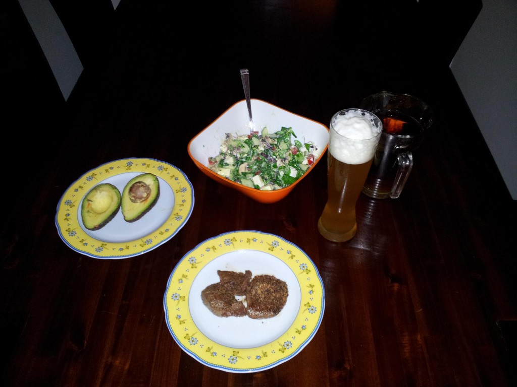 Beilage: 1 Avocado Getränk:0,5 Liter alkoholfreies Weisbier, 1 Liter Pfefferminztee