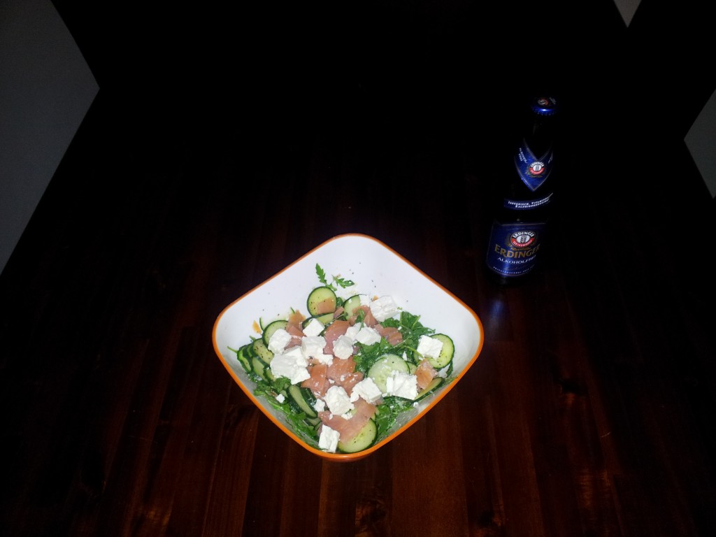 Ruccola Salat mit Gurke, Rächerlachs und Schafskäse