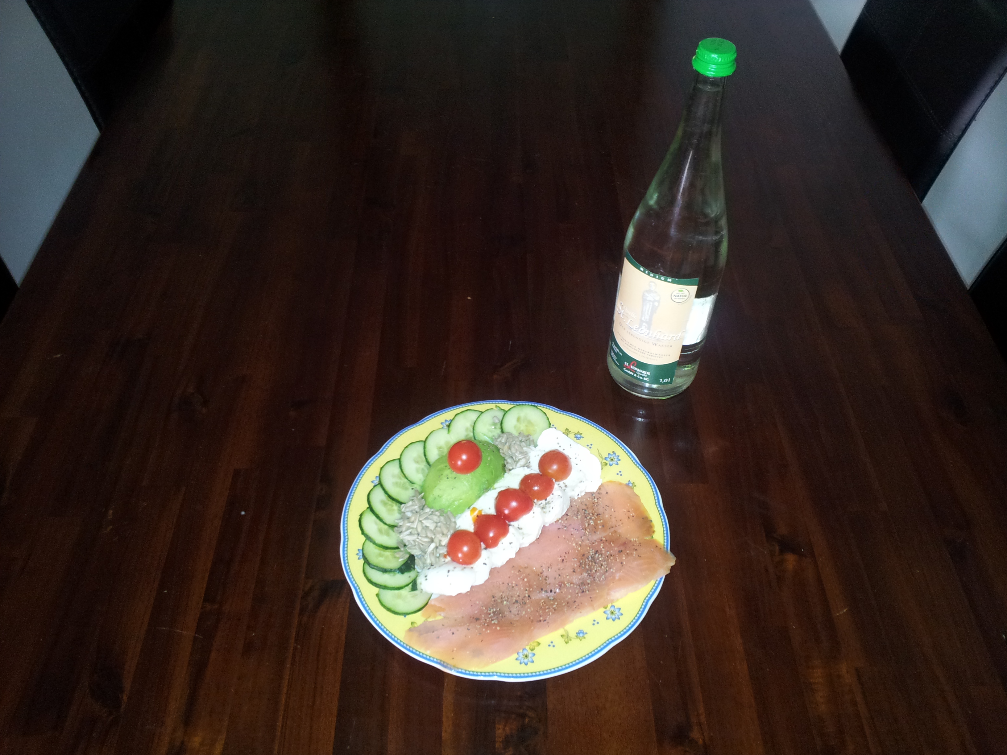 Zutaten: 150 g Räucherlachs mit 100 g Mozzarella geschnitten, 100 g Romatomaten, 0,5 Gurke geschnitten, 50 g Sonnenblumenkernen und 1 Avocado.
